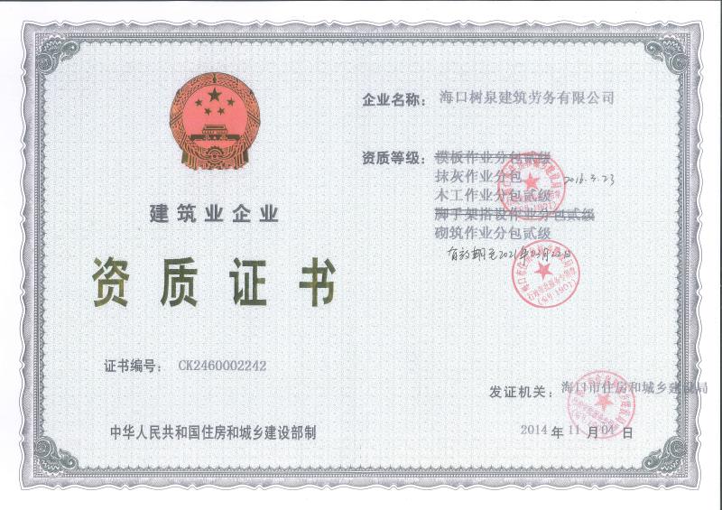 ??跇淙ㄖ趧沼邢薰境闪⒂?011年,公司位于海口,其前身是一家專業建筑施工隊,自2004年即開始在海南從事建筑勞務施工。自成立至今,公司已經擁有一支科學管理、質量過硬、能打硬仗,搶工期的專業隊伍。能獨立承擔大中型工業與民用建筑 、室內外裝修、各類機電設備安裝工程。代表工程有??跒I海華庭、三亞時代海岸T01/02/04/05棟高層、合肥東?;▓@二期、陵水富力灣B區高層、三亞金中海(酒店)、瓊海大印經典花園、??诃h球海景大酒店(四星級酒店,在建中)、陵水珍珠大廈(五星酒店)、海口萬達廣場、美蘭機場二期。